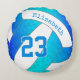 Dieses niedliche Volleyballkissen mit türkisblauem bis blauen Gradientenvolleyball-Grafik mit kontrastierenden weißen Paneelen, die ein künstlerisches, kaleidoskopisches Muster mit den farbigen Volleyballpanels aufweisen - ihr Name und die Jerseynummer sind durch katz_d_zynes in koordinierendem Blau anpassbar