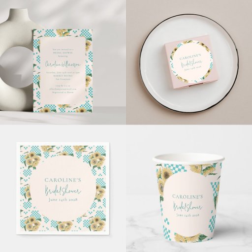 Retro Türkis Sonnenblumen Schachbrett Bridal Dusche Einladung