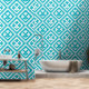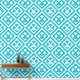 A turquoise geometric quilt pattern featuring stylized flowers within a diamond frame, bordered by zigzag shapes.
