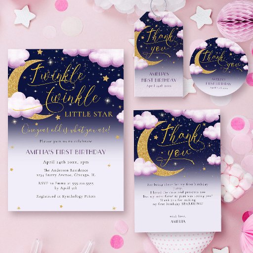 Twinkle Little Star Pink Girl Erster Geburtstag Einladung