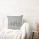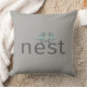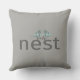 Einfache graue Typografie mit "unserem Nest" auf Throwkissen mit zwei gemusterten Vögeln. Die Hintergrundfarbe kann geändert werden, um Ihren Dekor und Art zusammenzubringen. Entwurf durch einfaches Leben.