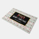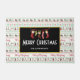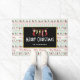 Eine Türmatte mit einem sich wiederholenden Muster im Hintergrund, in einem hässlichen Weihnachtspulli-Stil. Das Muster besteht aus Socken, Weihnachtsbällen, Sternen und Schneeflocken. Mit wiederholtem frohen Weihnachtstext in rot. Spaß und Feierlichkeit. Oben platziert ist ein schwarzes Rechteck mit einem goldenen Rahmen für Imitate, innen ist eine Abbildung von altmodischen hängenden Strümpfen und Ihrem personalisierten Namen.