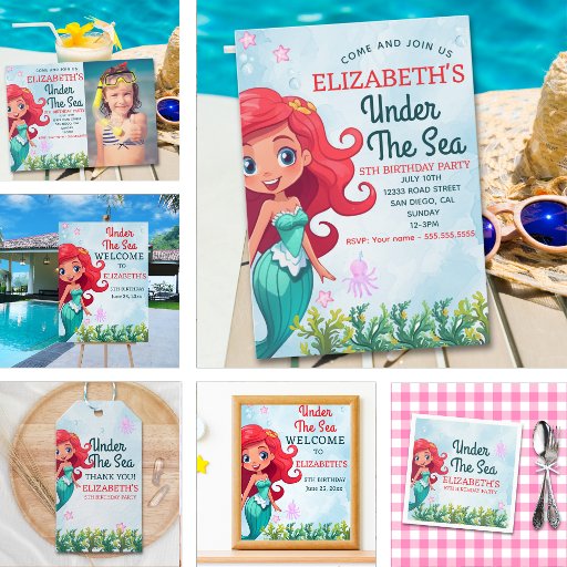 Celebrate your little mermaid's birthday with this cute Under the Sea Mermaid design. The design features the image of a cute smiling mermaid swimming under the sea. The design has your party details that can be personalized. For complementary products please check out the collection of this cute mermaid themed birthday girl design.