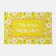 Helles und sonniges Drehmuster mit weißen Blume mit rosa und grünen Mittelpunkten auf gelbem Hintergrund. Gelbe mittlere Textbox mit benutzerdefinierbarem Text "This is our happy place"