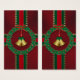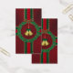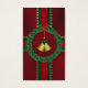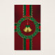 Goldene Glocken in der Mitte eines heiligen Kranzes aus dunklen Blätter und roten Edelsteinen für Beeren, durchkreuzt von roten und grünen, mit goldenen Sternen umsäumten Bändern. Wie ein Weihnachtsgeschenk in dunkelrot verpackt und mit hellen Streifen gebunden.