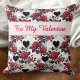Surprise your Valentine with this romantic patterned throw pillow. With red roses and black hearts, this design is inspired by classic romance, retro charm and a touch of gothic flair. Across the center is a 'ribbon' effect in pale blush pink, with the message 'To My Valentine' in elegant script typography. The back of the cushion is pale pink with customizable text for your own message. An ideal Valentine's Day gift for someone special.