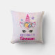 Ein quadratisches Kissen mit einem inspirierenden Zitat, das besagt: Vergiss nicht zu träumen. Die Einrichtung ist mit einem trendigen rosa Einhorn gestaltet. Mit einem extravaganten Blumenkopfteil verziert. Whimsikale Schmetterlinge fliegen herum. Ein blasser, lila, rosa und gelber Hintergrund.