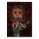Ein digitales Bild eines verbrannten Rocksterns, der aus einer Bleistiftskizze entstanden ist. Der Musiker spielt eine grüne Gitarre und hat braunes Haar und rosa Haut. Der Zeichentrickcharakter hat große Lippen und dunkle Kreise um seine Augen. Der Hintergrund ist dunkelrot mit schwarzen Wirbel und einem subtilen Zoomeffekt.