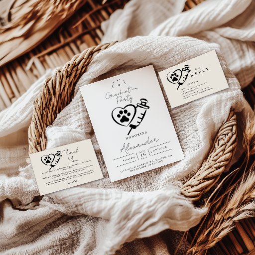 This graduation party design is created especially for a veterinarian graduate, featuring a clean, minimalist layout with a stethoscope and paw illustration. The modern black-and-white style keeps the focus on the achievement while adding a subtle, professional nod to veterinary medicine.