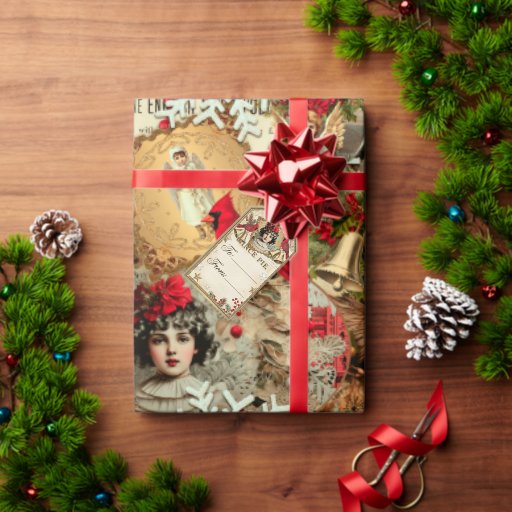 The overall effect of this Victorian Christmas collage ribbon is one of elegance, nostalgia, and a deep appreciation for the traditions of the past. It is a perfect choice for wrapping gifts, as it not only conceals the present but also adds an extra layer of sentiment and historical charm to the holiday season. The attention to detail and the classic imagery make it a cherished part of the gift-giving experience, evoking the spirit of a Victorian Christmas celebration.