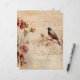 Ein Viktorianisches Scrapbook-Papier mit einer Collage von Musiknoten, gelblich und mit getrockneten gepressten roten Blume verwoben, in dem ein schöner Vogel auf einem Zweig dargestellt wird.