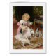 Ein entzückendes kleines Mädchen knit auf dem Boden mit ihrem Teacup, während sie einen Saucer des Tees ihren vier spielerischen Welpen anbietet. Die Grafik ist durch Arthur John Elsley (1860-1952) der für seine Malereien der Kinder und ihrer Haustiere berühmt war. Karte ist leeres Innere für Ihre eigene Mitteilung.