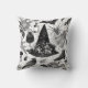 Ein Vintages Schwarz-Weiß-Hexenmuster mit Hexenhut, Besen, Schuhen, Tränen, Spinnen und anderen Halloween-Ephemeriden. Fun Schwarz-Weiß Vintage ephemera Halloween werfen Kissen. Entworfen für Sie von BlackBerry Boulevard.