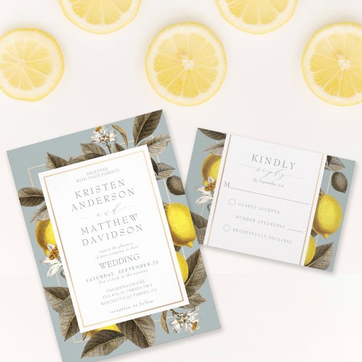 Dieses Hochzeitsdesign ist mit einem Vintagen Zitronenprint in der Pflanze und wurde so konzipiert, um Ihren Hochzeitsbedarf durch eine einzigartige Zitrusfrüchte-Touch zu ergänzen. Der Hintergrund der Karte ist staubblau und das Design besteht aus zwei goldenen Rahmen.