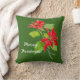Das ist das perfekte Weihnachtskissen mit einem Bild von Vintagen roten Poinsettia-Blume mit hellgrünen Blätter auf dunkelgrünem Hintergrund und dem Gruß frohe Weihnachten! in einem niedlichen, weißen Drehbuch.