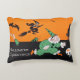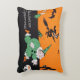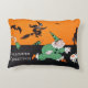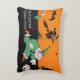 Dieses niedliche Halloween-Kissen zeigt eine Vintage Darstellung eines Mädchens, das zu Halloween als Clown verkleidet ist und von Hexen, Fledermäusen, Skeletten und einer schwarzen Katze gejagt wird.