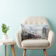 Ein Kissen mit einem Foto einer schneebedeckten Winterlandschaft mit schneebedeckten Kiefern. Ein roter, goldener und schwarzer altmodischer Zug, der durch die Wildnis fährt. Verspricht Gedanken, zu Weihnachten Zuhause zu kommen.