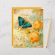 Grosser Schmetterling in blau grün mit orangefarbenen Rose, Blätter und grunge ephemera Skript Hintergrund.
