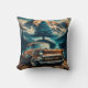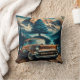 Ein Vintage-Wagen mit Blumenmotiven steht vor einer landschaftlichen Kulisse von Bergen, einem Fluss und einem üppigen Wald, der ein Gefühl von Nostalgie und natürlicher Schönheit erweckt.