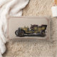 Eine Oldtimer-Illustration in Gelb und Rot, umgeben von einem Rahmen in weichem Rot vor einem weichen cremefarbenen Hintergrund. Ideal für eine Halle oder ein Büro.