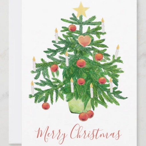 Vintage Christmas Tree illustration with a star on the top, heart cookie, candles and red apple ornaments.