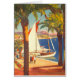 Besondere Vintage europäische Reisewerbung - Strand, Dorf, Menschen, Palmen, blaues Meer und Himmelsbild
