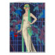 Reizende Vintage Modeillustration von einer französischen Zeitschrift. Frau im langen weißen Kleid mit grünem Stirnband und Schärpe. Sie ist in einer Traubenlaube stehend. Hintergrund ist blau.