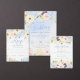 Süßes Frühlingsbukett mit rosa Rosen, blauen Hydrangeas, lila und gelbe Blume auf einem Aquarellblau. Elegante, moderne Schrift-Typografie mit feinen Wirbel. Weiche Pastelltöne in Gelb, Blau und Rosa sind die Hauptfarben dieser Hochzeitssuite. Personalisieren Sie den Text, fügen Sie Hochzeitsinformationen hinzu und machen Sie diese Einladung.