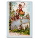 Ein Vintages Osterkartenbild zeigt eine Waldlandschaft mit zwei Kindern, die auf einem großen, farbigen Osterei spielen und lachen. Neben ihnen grast ein Lamm mit einem Blumenkranz um den Hals. Der Junge hält einen Korb mit Blume, während das Mädchen einen blühenden Zweig in der Hand in die Luft hebt. Auf der Vorderseite der Karte steht "Ostergrüße" und die Botschaft dahinter lautet: "Happy Oaster, Happy Spring, Happy, Happy, Happy alles!"