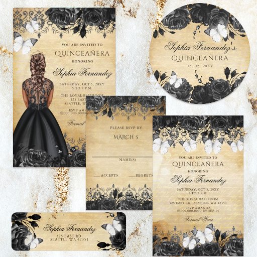 Vintage Prinzessin Black Butterfly Quinceañera EinladungVintage Prinzessin Black Butterfly Quinceañera Einladung (Vorderseite)Vintage Prinzessin Black Butterfly Quinceañera Einladung (Rückseite)