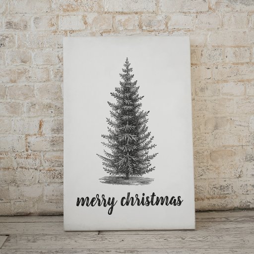 Ein Vintages, rustikales Weihnachtsgeschenk mit einer Illustration eines Fichtenbaumes. Ein rustikales, minimalistisches, neutrales Bauernhaus, weiße Weihnachtsbilder.