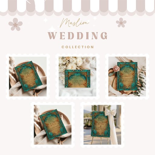An opulent Islamic wedding design featuring a teal and gold arched frame inspired by mosque architecture and Persian artistry. With intricate floral motifs and geometric symmetry, this invitation exudes elegance, spirituality, and timeless cultural refinement — ideal for a luxurious Islamic wedding.