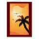 Vintages Bild der Reise und des Transports mit einem Flugzeug, das an einer Silhouette Palmen und einer kleinen Karte von Hawaii und den Hawaiianischen Inseln vorbeifliegt. Der Himmel ist eine schöne orangefarbene Farbe mit dem Sonnenuntergang.