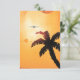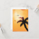 Vintages Bild der Reise und des Transports mit einem Flugzeug, das an einer Silhouette Palmen und einer kleinen Karte von Hawaii und den Hawaiianischen Inseln vorbeifliegt. Der Himmel ist eine schöne orangefarbene Farbe mit dem Sonnenuntergang.