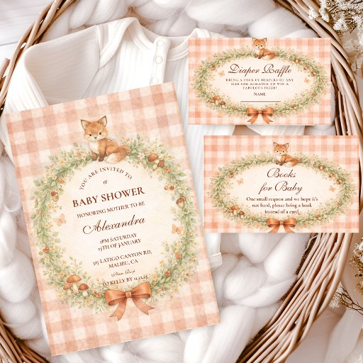 A charming woodland-inspired baby shower design featuring a sweet watercolor fox resting above a delicate floral wreath. Soft greenery, tiny mushrooms, and wildflowers create a cozy forest frame, finished with a warm bow and a soft peach gingham background. The vintage storybook illustration style and gentle earthy palette give the design a whimsical woodland nursery feel, perfect for celebrating a little one in a warm and magical forest setting.