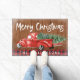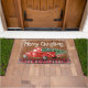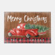 Rustikaler Vintager Red Pick up Truck mit Weihnachtsbaum auf einem rustikalen Holzboden und personalisiert mit Ihrem Familiennamen. Doormat ist mit Ihrem Familiennamen personalisiert. Frohe Weihnachten geschrieben in hübschen handgeschriebenen Schriftzeichen Typografie. Was für eine schöne Art, Ihre Familie und Freunde während der Ferienzeit auf Ihrem Zuhause begrüßen zu dürfen!
