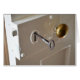 Ein Vintager Verschluss und ein Schlüssel in einer offenen weißen Tür. Die Grußkarte wird leer für Ihre Mitteilung, zum Beispiel, Glückwünsche auf einem neuen Zuhause, neuen Zuhauseinformationen, einer Einladung an ein Housewarming-Party oder einem Schlüssel zu meinem Herzen verlassen.