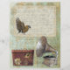 Vintag 1837 Letter over Lace Label mit einem Vogel und einem alten Skript, einem Gramophon, einer Hutbox über Gold und grünem Altpapier. Alte Werbung über Gold und grünes altes Papier auf der Rückseite.