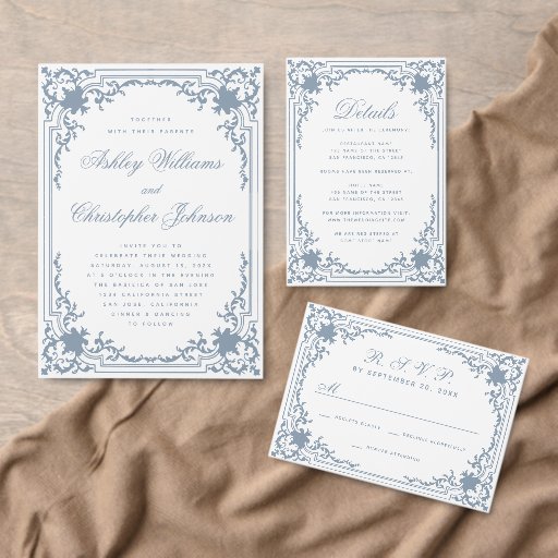 Diese elegante, blau-weiße Hochzeitskarte mit Vintager Luft hat einen Vintag staubblauen Rahmen mit barocken Dekorationen auf weißem Hintergrund. Der Text und die Zeilen sind auch staubblau. Der Titel UAWG wird in einem eleganten Kalligraphieskript geschrieben. Die Rückseite hat den gleichen antiken Rahmen, aber weiß auf staubblauem Hintergrund. Der Vintage, verzierte Rahmen basiert auf einer antiken französischen Buchbinderei von Georges Mercier (1885-1939) - Madame de Maupin von Theophile Gautier, Ausgabe 1911, jetzt öffentlich zugänglich.
