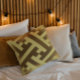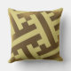 Goldfarben und hellbraun bilden ein Vintages japanisches Design. T-förmiges geometrisches Muster. Dieses dekorative Kissen besticht durch alte Designs, die liebevoll von Alma Wad restauriert wurden.