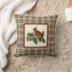 Quadratisches Throwkissen mit einer Vintagen Illustration eines hellen roten Kardinals auf einem Baum. Gerahmt und mit einem Plaidwerx ursprüngliches Waldlandweihnachtskarierten Muster in den Farben der Natur zurückgezogen - Moosgrün, Moosbeerrot, cremefarbenes und hellbraun. Zusammenbringen ringsum das Kissen verfügbar.
