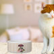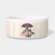 Hübsches Vintages Aussehen der Schüssel mit rosa gefärbtem Pilz mit rosa Blumen und üppig grünen Blätter auf einem Vintag gestreiften Hintergrund