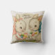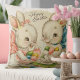 Das Kissen zeigt eine Vintage Abbildung eines Mädchenhauses, in einem rosa Bogen, und eines Jungen, der sich in einem blauen Bogen mit farbenfrohen Ostereiern zur Lieferung mit den Worten "Happy Oaster" oben zeigt. Hintergrund ist eine Imitat cremefarbene Leinenstruktur.