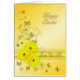Eine wunderschöne Osterkarte mit gelben, dunklen Blume auf einem lebhaften, wirbelnden Hintergrund.