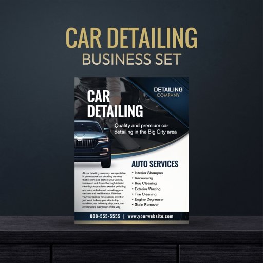 Werben Sie für Ihr Auto-Detaillierungs-Geschäft mit diesem schlanken und beruflichen Flyer-Template, entworfen in einem kühnen marineblau und silber Farbschema. Dieser vollständig bearbeitbare Flyer ist ideal für jedes Auto, das Unternehmen detailliert beschreibt, und ermöglicht es Ihnen, jeden Aspekt an Ihre Marke anzupassen - vom Firmennamen und Kontaktinformationen bis hin zu einem personalisierten Absatz, der Ihr Fachwissen unterstreicht. Zeigen Sie Ihr gesamtes Dienstleistungsangebot inklusive Freizeit, Innenschampoo, Wachsen und vieles mehr. Sie können auch bis zu drei individuell anpassbare Leistungspakete mit jeweils bearbeitbaren Preisen und Details zum Anzug Ihrer Angebote vorstellen. Dieser Flyer ist sauber, modern und wirkungsvoll und ist das ideale Marketing, um die Aufmerksamkeit zu erregen und neue Kunden zu gewinnen.