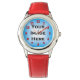 Um dieses Produkt anzupassen, laden Sie Ihr eigenes Hintergrundbild oder Foto wie oben gezeigt hoch. Diese benutzerdefinierte Uhrenvorlage mit roten Zahlen fügt Ihrem Hintergrund-Bild oder Foto einen schönen Farbakzent hinzu. Die Fallschatten geben den Zahlen in diesem flach gedruckten Zeitstück einen geprägten, fast 3D-Look. Dieses Design passt besonders gut zu patriotischen Hintergründen. Wenn sie mit einem passenden roten Band gepaart ist, wie hier gezeigt, macht sie eine coole Armbanduhr für Kinder und Jugendliche.