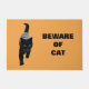 Fotografie einer niedlichen schwarzen Katze auf einem orangefarbenen Hintergrund mit dem Text Achtung vor Katze.