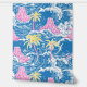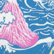 Ein nahtloses, von Hand gezeichnet Muster mit rosa Vulkanen inmitten eines rauen blauen Ozeans, umgeben von weißen Wellen und Palmen. Das Design verbindet dynamische Naturelemente mit einer skurrilen, künstlerischen Touch und schafft so einen einzigartigen und lebendigen visuellen Effekt.