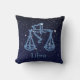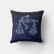 Wurfskissen, welches das Tierkreissymbol für Waage im weichen silbernen Blau, bedeckt mit den Sternen der Konstellation, gegen einen sternenklaren Himmelhintergrund geordnet vom tiefen Mitternachtsblau, um zu schwärzen kennzeichnet.