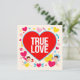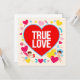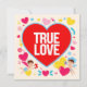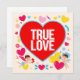 Dieses vibrierende, bunte Design feiert die Liebe und den Valentinstag mit einem großen roten Herz in der Mitte, das die Worte "TRUE LOVE" in gewagten weißen Buchstaben trägt. Um das zentrale Herz herum fügen eine Vielzahl von kleinen Herzen unterschiedlicher Farben (gelb, rosa, blau, rot) und farbigen Blüten einen fröhlichen und festlichen Touch hinzu. Zwei kleine Engel, einer links, der rote Herzen hält, und der andere rechts, der einen Bogen und einen Pfeil hält, umgeben das Herz, das Liebe und Romantik symbolisiert. Der schwarze Hintergrund zeigt die scharfen Farben und grafischen Elemente auf und erzeugt einen auffallenden Kontrast und zieht das Auge an. Dieses Design ist perfekt, um aufrichtige Gefühle der Liebe und Leidenschaft auszudrücken, ideal für Valentinskarten, Plakate oder romantische Auszeichnungen.